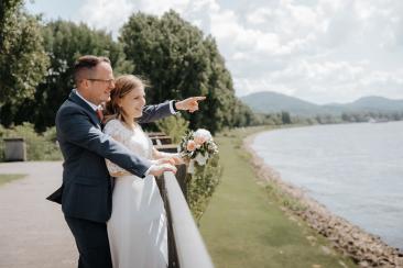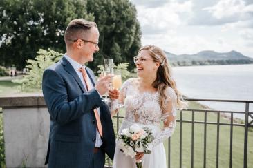 Anschließend begleiteten wir das Brautpaar an das Rheinufer in Bonn, nahe dem Kameha Grand Bonn, wo ein kleiner Sektempfang mit Familie und Trauzeugen stattfand. Mit Blick auf den Rhein entstanden natürliche, romantische und gefühlvolle Bilder voller Liebe und echter Momente.