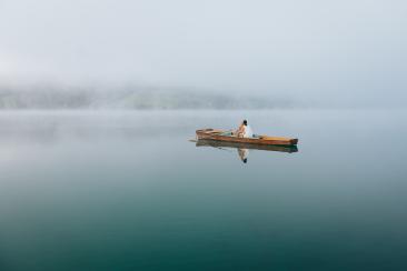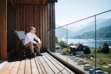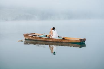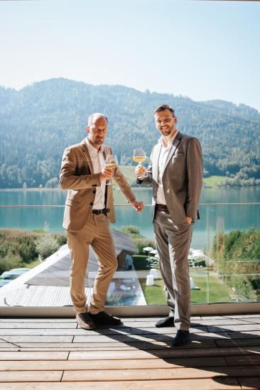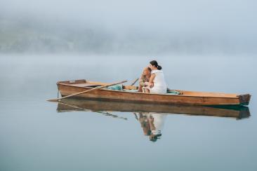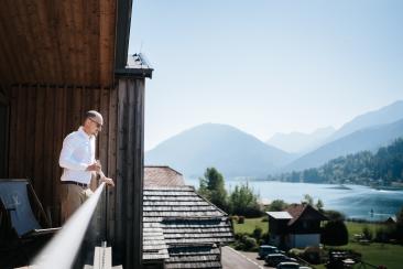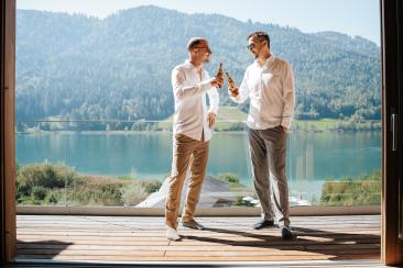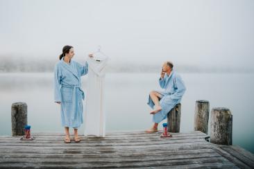 Die Anreise war lang – rund 900 Kilometer –, doch jeder einzelne davon hat sich gelohnt. Bereits morgens um 6:00 Uhr begann unser Tag mit einem ganz besonderen Shooting am Weißensee. Nebel lag still über dem Wasser, während die Sonne langsam durch die Wolken brach. Ines und Thomas kamen im Bademantel an den See – ruhig, vertraut, ganz bei sich. Anschließend ging es gemeinsam mit dem Boot hinaus auf den See, ein Moment voller Magie und Stille.