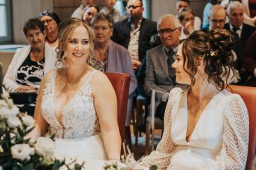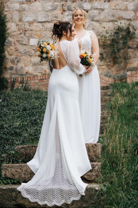 Die Trauung auf Schloss Liedberg bildete den perfekten Rahmen für ihr Ja-Wort. Umgeben von historischer Kulisse, warmem Herbstlicht und ihren Herzensmenschen sagten sich beide Bräute – beide in traumhaften Brautkleidern – „Ja“. Tränen der Rührung, leises Lachen und intensive Blicke machten diese Zeremonie zu einem der emotionalsten Momente des Tages. Man spürte in jeder Sekunde: Diese Liebe ist echt.